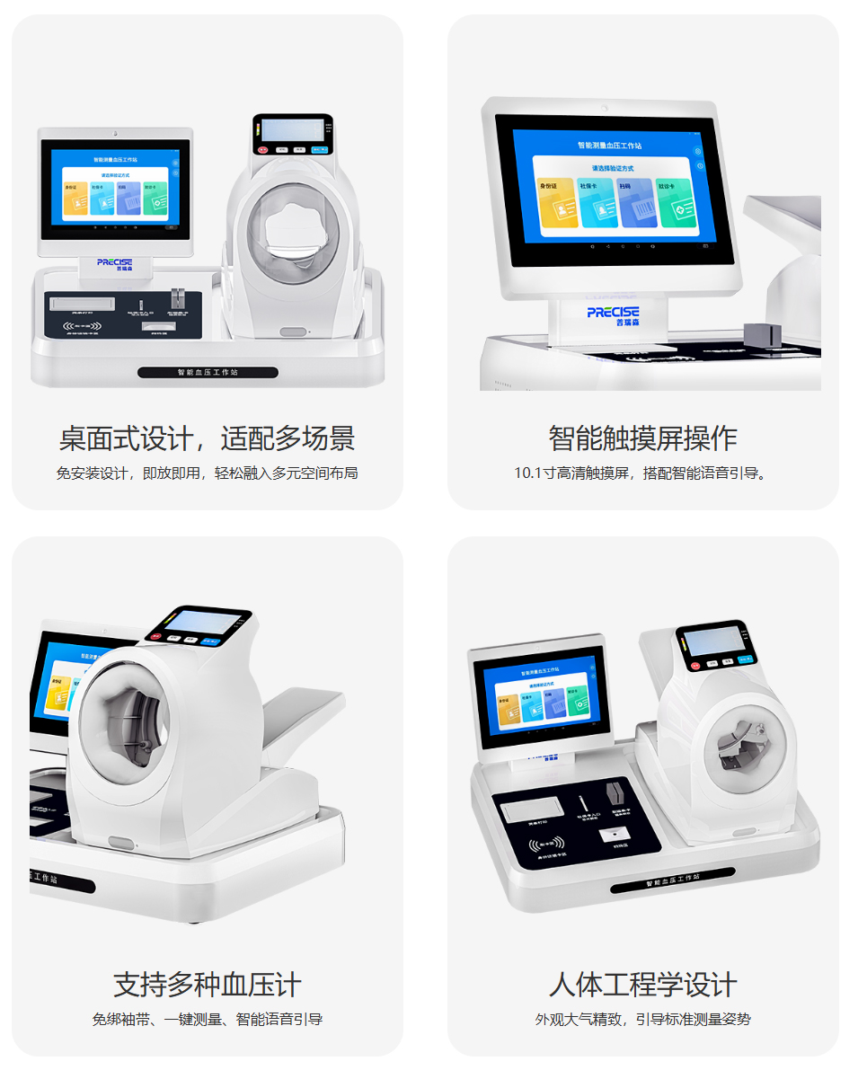 品牌名称:普瑞森 产品名称:智能血压测量工作站 产品型号:PRS-X1L 尺寸:58*43.5*34cm 标配功能:舒张压、收缩压、脉率 拓展功能:体温、血氧 屏幕尺寸:10.1寸高清触摸屏 登记方式:身份证、人脸识别、医保卡、IC卡、ID卡、条形码、二维码、磁条卡 可对接:医院HIS系统、电子病历系统、公卫系统、慢病管理平台。 适用场景