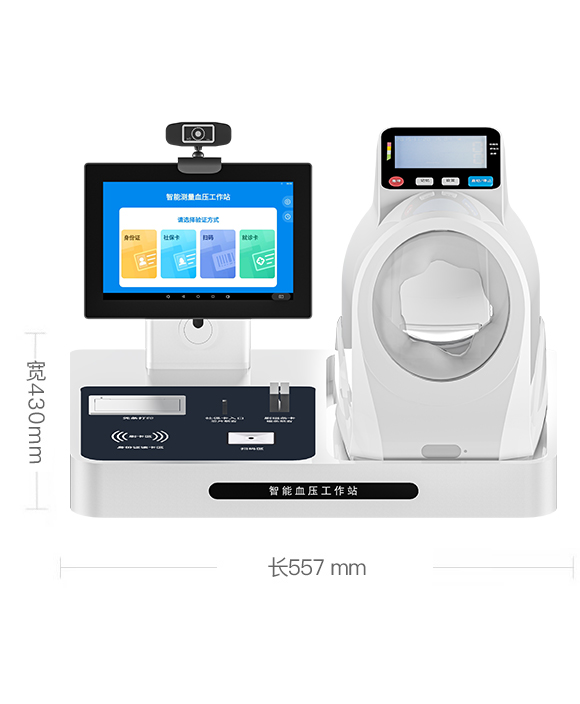 品牌名称:普瑞森 产品名称:智能血压测量工作站 产品型号:PRS-X1X 尺寸:55.7*43*32cm 标配功能:舒张压、收缩压、脉率 拓展功能:血氧、体温 屏幕尺寸:10.1寸高清触摸屏(屏幕可旋转,横竖切换) 登记方式:身份证、人脸识别、医保卡、IC卡、ID卡、条形码、二维码、磁条 可对接:医院HIS系统、电子病历系统、公卫系统、慢病管理平台。 适用场景